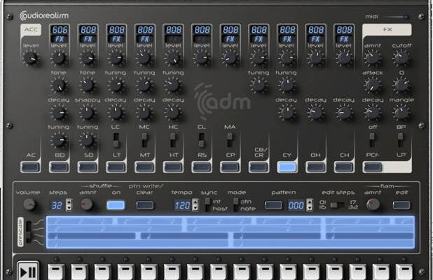 Booming bass drums, saucy cymbals and crispy snares can be used to describe the sound of drum machines from the early 80’s. ADM emulates three classic vintage drum machines from that era rolled into one, combined with a 32-step internal sequencer and pattern controlled effects (PCF). Get all your patterns into ADM via the Import Rebirth function or directly from your 909 via sysex (we will provide a free tool for dumping Sysex).