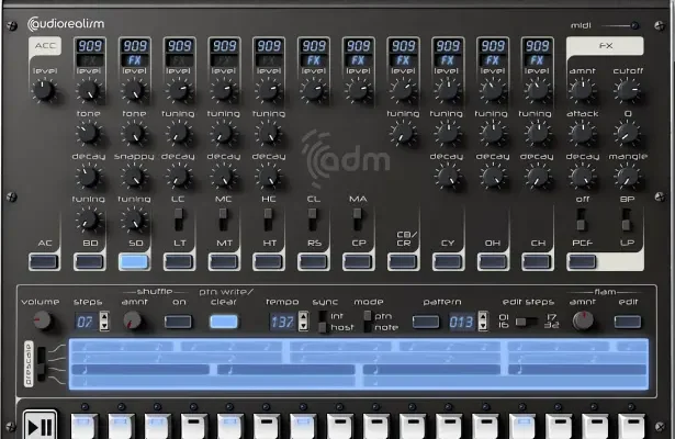 Import your patterns seamlessly into ADM using the Import Rebirth function or directly from your 909 via sysex with the provided free tool for sysex dumping. The hihats and cymbals in ADM closely resemble the originals in sound and response, making it a must-have for producers seeking that classic drum machine vibe.