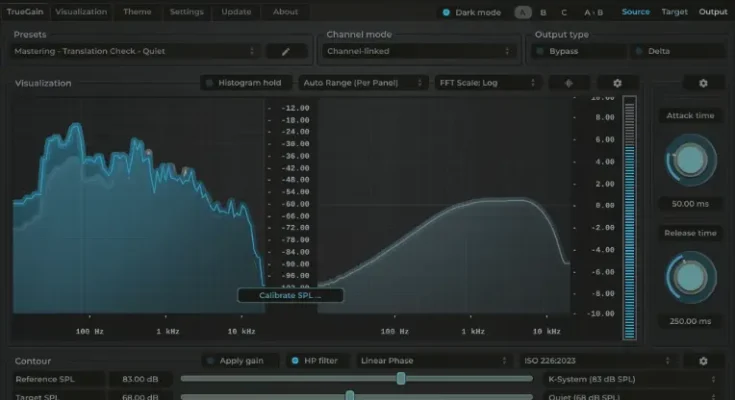 The core of TrueGain is its ability to perform “translation checks.” After a simple one-time calibration to your monitoring setup, you can use TrueGain to simulate how your mix will sound at different loudness levels, all without changing the actual volume of your monitors or headphones. This allows you to quickly check how the bass will hold up or if the vocals will become harsh in quieter listening environments, ensuring your mix translates reliably.