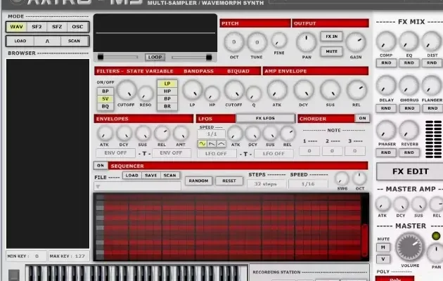 It brings a powerful Note Sequencer for each mode/sampler and 8 effects: Compressor, Equalizer, Distortion, Delay, Chorus, Flanger, Phaser and Reverb..