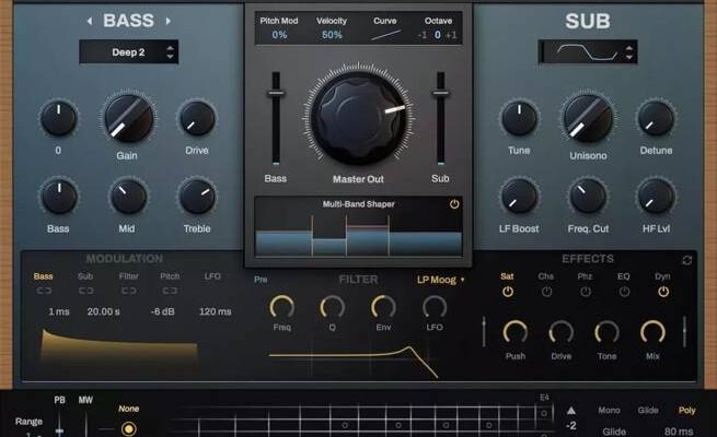 Create dynamic bass sounds with a variety of tones, synth waves, filters, and a comprehensive effects rack.