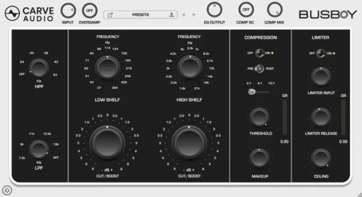 Busboy was designed to serve your mix. It pairs rich, musical high and low shelves with precise high- and low-pass filters, then brings everything together with smooth compression and a final limiter for clean peak control and a polished, finished sound.