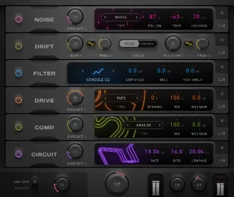 • Build custom FX racks with six reorderable modules: Drive, Circuit, Drift, Comp, Noise, Filter