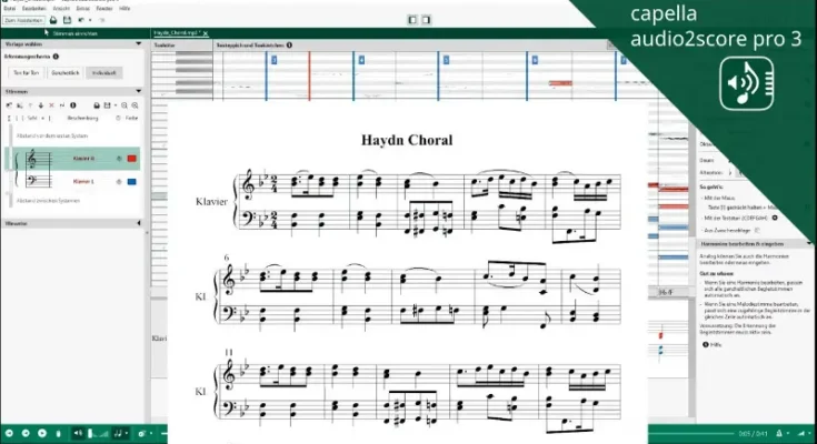capella audio2score analyzes your recording, e.g. an MP3 file. The recognized notes are examined, sorted and then sensibly poured into a new arrangement. This can be done for piano or for a quartet, for example – it’s your choice.