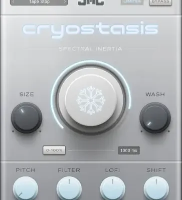 Cryostasis is a spectral inertia effect that can progressively smear your audio until infinitely frozen in time. It features spectral FX and controls to shape the character of the frozen tail. All are controlled by a continuously variable freeze knob or an auto switch that can be timed in milliseconds or musical measures (double-click).