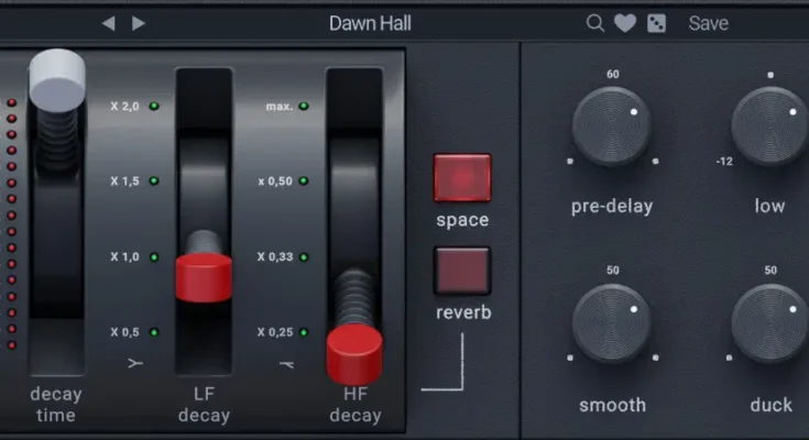 Dawn gives you access to the full range of reverb times from the original unit, from 0.4 seconds through to 4.5 seconds, alongside the distinctive Low Frequency Decay and High Frequency Decay (damping) controls. Get creative with the immersive Space mode, with a near endless decay time – great for ethereal pads and synths.