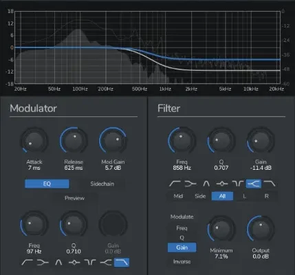 Using sidechain detection you can dynamically sculpt your audio using another audio channel as the source. For example, you can automatically remove mid range frequencies when the vocal is playing, or remove the sub bass when the kick hits.