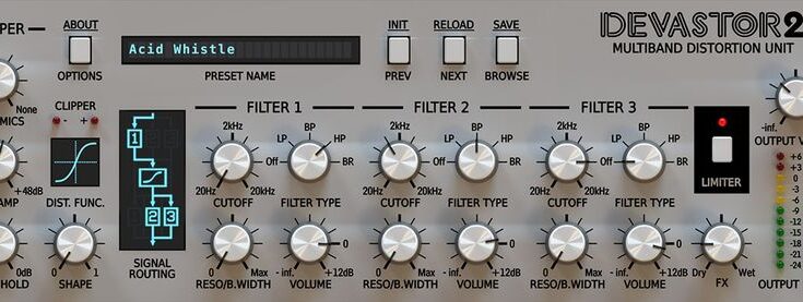 Devastor’s filters are not simply the peaking EQ type which are commonly used in classic multiband distortion units: rather, they are like those found in analog synthesizers (low pass, high pass, band pass and band reject) with adjustable resonance and cutoff parameters.