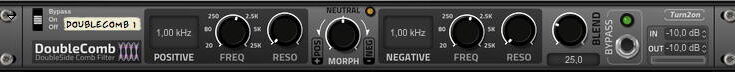 Positive and Negative modes have peaks at 0Hz. Classical Comb filters normally use selected positive or negative modes, but we allow morphing of these modes at the same time. The device includes two individual Comb filters with customizable settings, which you can morph between.
