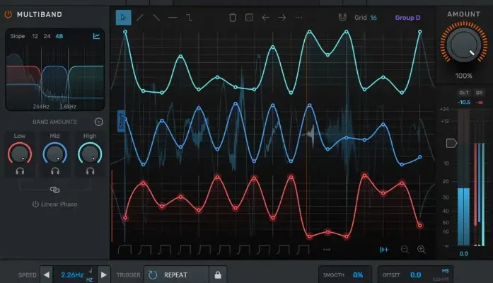 Run Duck in Repeat mode, or use sidechained audio or MIDI signals to trigger, with optional lookahead for glitch free audio