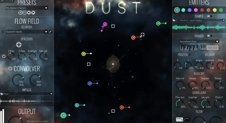 DUST is a synthesizer plugin based on a real-time particle simulation, where each particle is a separate granulating sound source. The motion of each particle is determined by the flow field, which determines the force applied to each particle at each point. Just like how the flow of a river determines the path of a leaf floating down in it. This is our most ambitious software release to date, and you are going to love it! Not only is DUST addictive to play with, but it generates some of the coolest sounds ever created.