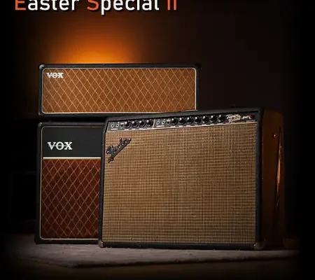 Easter Special II contains 5 full captures of a 1967 Fender Twin Reverb blended with a 1964 VOX AC30 Top Boost Super Twin. This along with the pairing with a Deluxe Reverb is one of the most coveted dual amp setups and is a bit more open and bigger sounding than the Deluxe Reverb pairing, where both amps have quite a bit more compression.