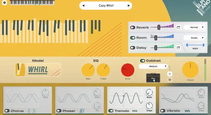 Elpiano includes five cabinet models in both mono and stereo configurations, a collection of inspiring and diverse presets, and a range of built-in effects like drive, reverb, room simulation, delay, tremolo, vibrato, chorus and phaser. A classic EQ section adds warmth and presence.