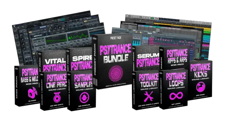 Psytrance Bundle is a massive package with more than 285 Presets, 5 Sound Libraries with 650 Samples, Loops & Fx, 170 Midis, sounds inspired by artists like Vini Vici, Kshmr, Astrix, Liquid Soul, Infected Mushroom, Ace Ventura, among others!