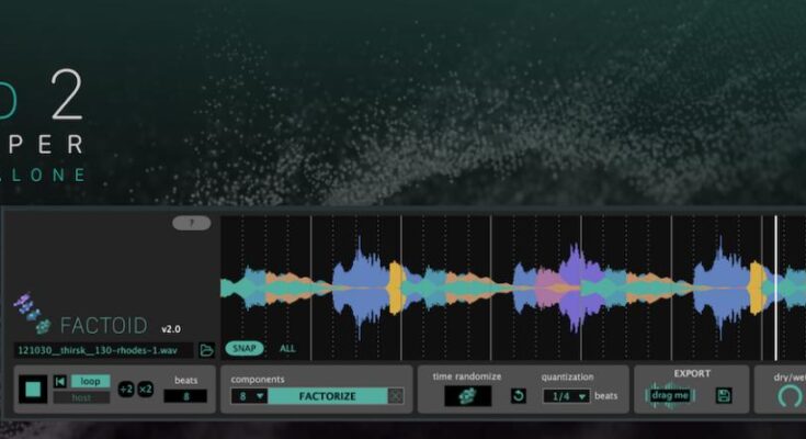 Based on the same machine learning decomposition engine than Factorsynth, Factoid is able to extract between 2 and 8 components that overlap in time in the original sample. For example, in a drum loop, it can often separate snare from kick even if they play at the same time in the original clip. Once extracted, the different layers can be remixed and displaced in time, with or without quantization.
