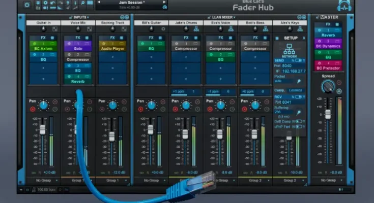 Blue Cat’s Fader Hub is a network mixing and streaming software that provides an easy solution to play and record with other musicians on a local network or thru the Internet in real time.
