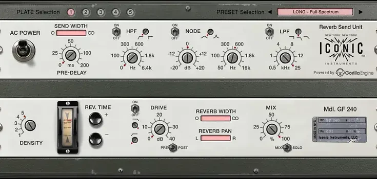 Powered by Gorilla Engine, and made in collaboration with Numerical Sound, the GF240 includes classic functionality, like a pre-delay control, send width, a filter section with high- and low-pass filters, as well as a shapable node, tail length control from a full 6 seconds down to a mere 20ms (much shorter than an analog unit) and a mix control with a convenient solo switch to preview only the reverberation.