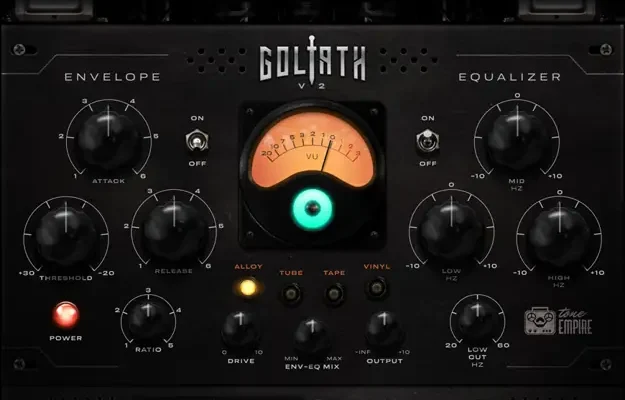 Goliath V2 features 4 Analog Modelled Processing chains featuring ALLOY (Nickel, Iron, Steel based Transformers), TUBE, TAPE & VINYL with a drive control plus a FET based envelope and a 3 band EQ. This is a truly revolutionary and “analog” sounding tool. Be prepared to be pleasantly surprised! Goliath, our top-selling plugin is back in a brand new avatar with a completely new sound engine and new features. This plugin now has 4 types of Saturation models – Alloy, Tube, Tape & Vinyl with Drive. We now use our Advanced DSP models featuring our own proprietary “Multi Convolution” & Component Modelling Technique to simulate “Real” hardware chains of analog gear. Additionally, the plugin now features a full FET compressor in its envelope section and a 3 band EQ plus a Low Cut Filter.