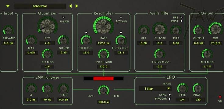 But what Jaws is really about is that you can use all those effects in a creative, fluid way. With the Envelope Follower you can add more crunch to the loud parts of your track (or the softer parts). The LFO makes it possible to create all kinds of weird oscillating effects. If you use this subtly you can add some ‘jitter’ to the sound. On extreme settings you can really go through the roof, and alter the sound beyond recognition.