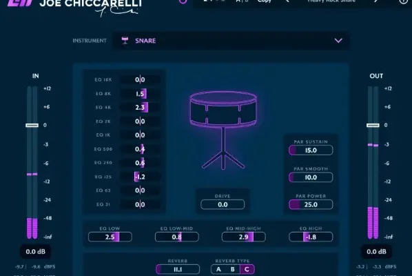 The Joe Chiccarelli signature plugin has 11 distinct profiles: kick, snare, toms, drum overhead, drum room, bass di, bass amp, acoustic guitar, electric guitar, electric piano, and lead vocal. Each profile has a set of parameters controlling drive, EQs, compression, parallel compression, and effects. Distilled to the right amount of control, conceived to get your sound instantly.