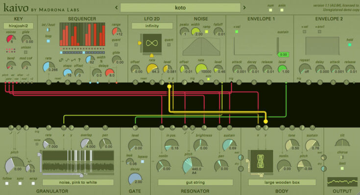 Kaivo brings some of the latest academic research in physical modeling to a patchable package for the first time. Mathematically speaking, its finite difference time domain (FDTD) models let the player reach inside the instrument and affect the internal vibrations at any point. This allows for a fine degree of realistic detail, like the bridge rattles on a “gut string” model, for example. And while Kaivo is capable of making very realistic sounds, it is also designed to apply this subtlety to abstract creations.