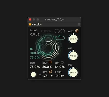 Minimal feedback latency granular. Designed for immediacy and precision. The ring buffer self-adjusts to grain size, eliminating lag and keeping feedback alive at the speed of sound. Pitch shifts cut sharper and hit cleaner, with expressivity amplified. The window curve shapes the attack and rounds the decay, creating a natural, percussive flow. By balancing post- and pre-feedback paths, Simplos also functions as a spatial delay instrument, capable of expansive and airborne textures.
