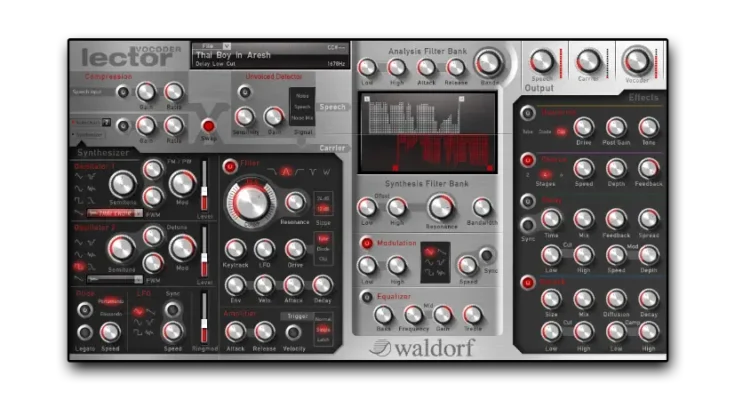 Lector is a vocoder with superior intelligibility and performance. The 100 band stereo vocoder core is flanked by a synthesizer section on the left and a rich effects section on the right. The intensities of up to 100 frequency bands in the analysis section control the same number of stereo bandpass filters in the synthesis filter bank using envelope followers with adjustable attack and decay. The integrated synthesizer or an external source serves as carrier signal and is fed into the synthesis filter bank. Besides the effects section, there are numerous features that make this vocoder unique.