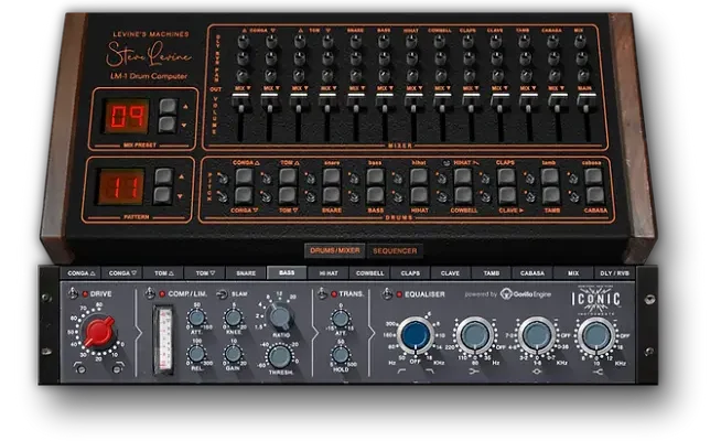 The sound of the Levine’s Machines – Drum Machine is instantly recognizable, and it can be tuned and manipulated (just like the original) to create a unique footprint for your tracks. But in addition to the original sounds and sound-shaping, the Levine’s Machines – Drum Machine by Iconic Instruments offers a full-featured sequencer, and a full mixing environment, with channel and mix bus effects chains, which include Drive, Compressor/Limiter, Transient Control and 4-band British-style EQ, all modeled from specific classic gear that Steve used in the 1980’s. There are channel and mix bus send effects, which are emulations of Steve’s most-used 80’s-era digital delay and reverb units. Each channel and effect can be bused within your DAW to a unique output, so that you have the option of printing or mixing in your DAW, rather than within the Levine’s Machines – Drum Machine. And finally, the Levine’s Machines – Drum Machine comes packed with 20 Mix and Pattern presets, crafted by Steve himself, to give you ready-to-use drum sounds, or to use as a starting point for your tracks.