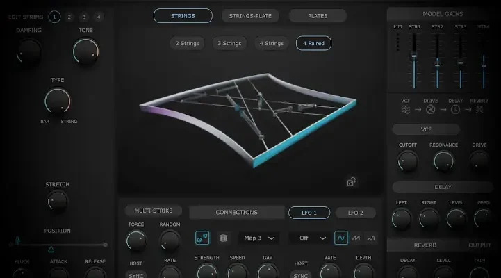 Each voice has up to four connected strings which can be plucked or act as resonators. The strings are connected by either rattles that give collision effects as the strings vibrate, or nonlinear springs. Physical parameters control the decay, mass and harmonic content along with individual semitone and fine tuning controls.