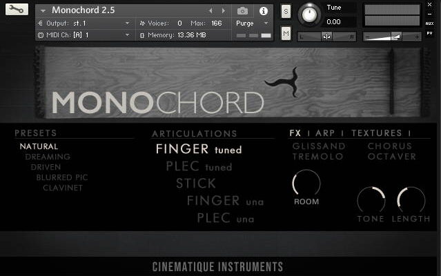 Firstly, we recorded separately each of the 21 strings of the Monochord plucked both with hands and plec in 2 or 3 dynamic variations. We mapped the strings in a range from C2 to C5 that you can pass your hands alternately over the keys related to the strings of the Monochord. Using this playing technique, you get the typical long-lasting sound of the Monochord, which you can transpose by using the key switch. Beyond that, we recorded single strings in several Round Robin variations and dynamic layers so that you can play the Monochord chromatically.