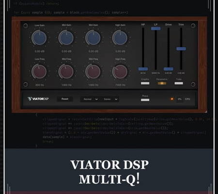 I call it the Multi-Q – three EQ models in one plugin, a graphic, parametric, and tube EQ. You can use all three EQ’s at once if you wish or just one band. The filters turn off at 0 dB of gain to save precious CPU, so don’t be afraid to load it up to just use one band. Multi-Q also has low and high pass filters, a drive for tube distortion, mid/side processing, oversampling, and a phase inversion. Use the 3 buttons on the right side to switch EQ UI focus and have at it!