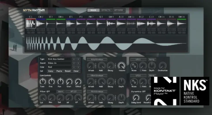 Myth Rhythm combines deep modulation, powerful effects, and avant-garde sound design in a seamless, NKS2-integrated multi-cell percussion and sound FX instrument.