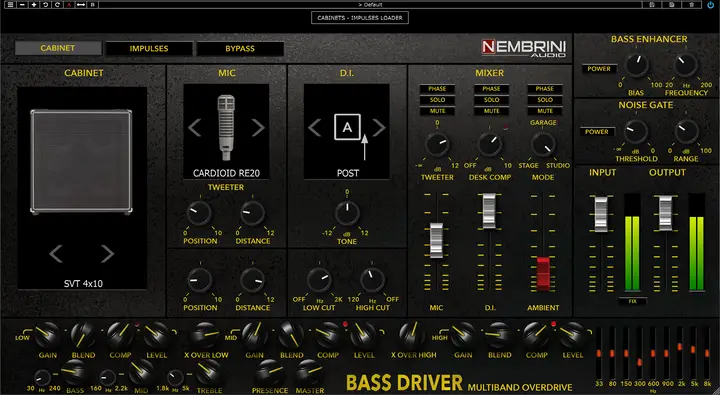 Nembrini Audio Bass Driver is a 3 band overdrive / amp sim based on the SansAmp Bass Driver DI*, featuring parametric crossovers to heavily sculpt your bass guitar tone and achieve a modern balance and texture.