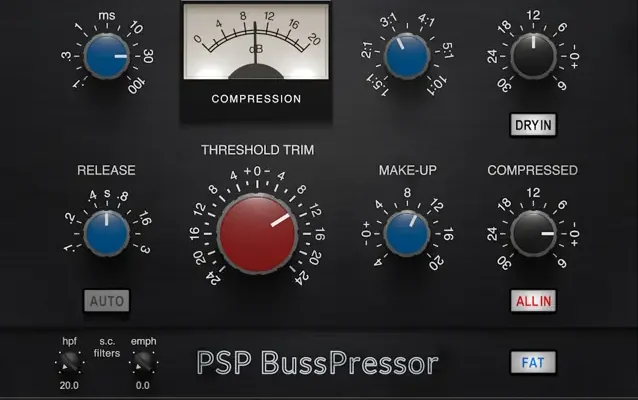 PSP BussPressor is a compressor optimized for group and master buss processing. It combines the sound of classic VCA compression with wide tuning capabilities, while it’s extra controls allow you to adjust a side chain high pass filter or apply parallel compression with ease.