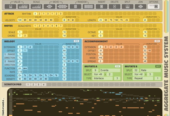 Aggregate is a generative music player for Reason that allows the user to control meta-parameters of music composition. Lists of values are iterated over with time durations then aggregated with other lists such that they change over time in complex ways. Users define a rhythm, scale, and chord progression which are then used as the basis for two separate generators, a melody generator and an accompaniment generator. The musical results can then be further mutated with two separate mutation engines.