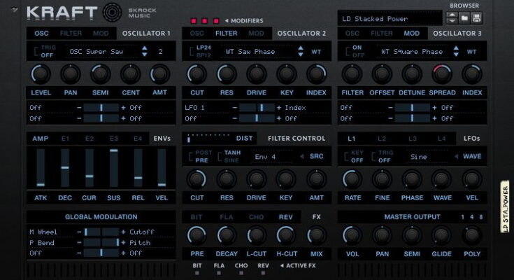 The Kraft Synthesizer is a 3 oscillator synth with advanced spread/offset capabilities and dedicated filters for each oscillator.
