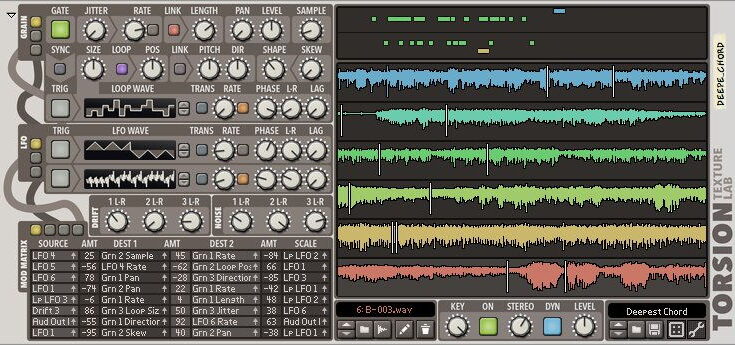 There are 3 grain engines and 6 user audio samples. Each grain engine can use any of the 6 samples. Each grain engine also has a dedicated loop LFO that is used to loop over samples. Torsion has 6 Stereo LFOs, 3 Stereo Drift Modulators, 3 Stereo Noise Modulators, and a 32 point Modulation Matrix.