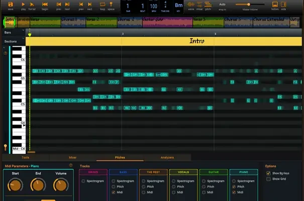 AI algorithms convert audio into pitch and midi notes. The Pitches Viewer allows you to selectively view the spectrograms and notes of all tracks in the song. It is a useful tool to assist you in transcribing music and for viewing how the various parts combine to make the song.