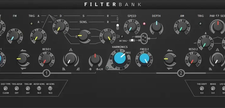 HARMONICS: A 12-position rotary switch that defines the harmonic relationship between Filter 1 and Filter 2. “FREE” allows independent control, while the numbered positions lock Filter 2 to specific musical intervals relative to Filter 1.