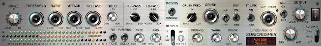 Linda Audio releases Sonicrusher – versatile compressor plugin with some extra features. Sonicrusher does not model any real hardware but it is capable of everything from gentle transparent compression to extreme compression that will smack your drums hard. It can be run in Modern level detector mode (feed-forward) for fast and hard transient shaping, or Vintage (feed-back) detector mode which is more gentle. It has adjustable knee and RMS and of course hi-pass (and even lo-pass) sidechain filter. It can work also in “Split” mode, which compresses high frequencies separately with slightly different parameters (It is useful for example on vocals or on some synths). One other special feature is “Crush” – band-pass or hi-pass filter with overdrive which can add some life back to the compressed signal and even can be controlled by actual compression. There is also clipper with adjustable threshold, and dry/wet mix. Automatic gain compensation is also available.