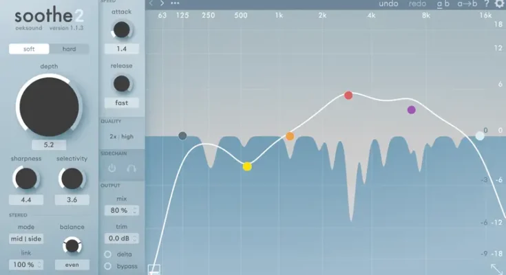 Soothe2 is a dynamic resonance suppressor. It identifies problematic resonances on the fly and applies matching reduction automatically. This results in a smoother, more balanced sound and saves you from having to notch out frequencies by hand. The reduction only kicks in when and where needed, without affecting nearby frequency areas. This preserves the timbre of the original sound source resulting in a transparent treatment with minimal artifacts.