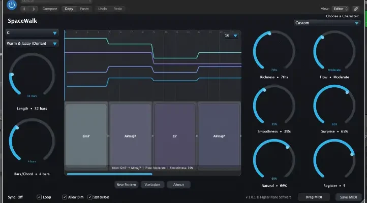 Writing ambient music shouldn’t mean staring at a piano roll for hours or memorising chord theory. SpaceWalk generates evolving, expressive progressions so you can focus on the music, not the mechanics.