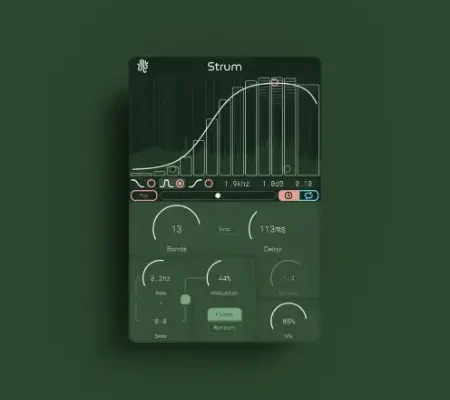 Strum can work either in “free” or “sync” mode, where in “sync” mode each individual band’s delay time is synchronized to the tempo & time signature of your DAW, allowing for rhythmically-aware strumming.