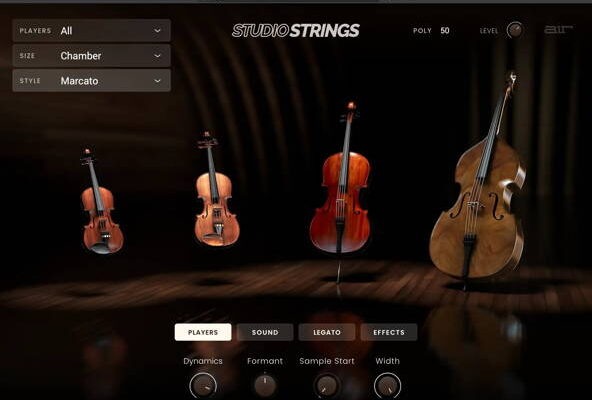 Choose the string section size with options for a whole orchestra, a chamber set, or solo instruments.