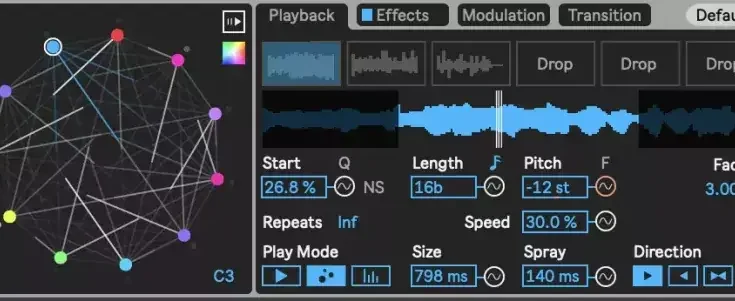 3 different playback modes: normal, granular, and spectral. Granular and spectral have a speed parameter for time stretching. Granular mode has grain size and spray options
