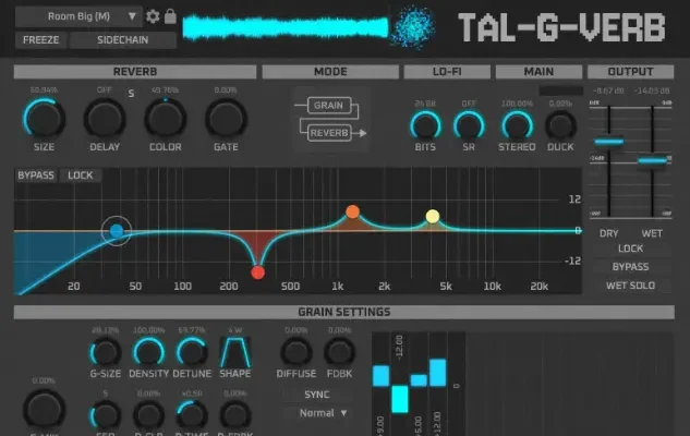 TAL-G-Verb is a musical effect capable to build high quality artificial reverb sounds. Suitable for all types of sounds from drums to huge pads and special effects. An internal editor allows to manipulate and tune the reverb algorithm for your needs. The embedded grain engine has the power to convert mono sounds into huge complex cinematic stereo sounds, chords and synced arp patterns. TAL-G-Verb contains more than 100 factory presets, divided into different categories such as drums, vocals and synth reverbs.