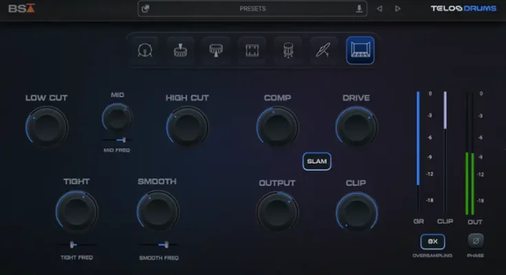 Telos – Drums has 7 finely-tuned modes to cover your entire drum kit: Kick, Snare Top & Bottom, Rack & Floor Toms, Cymbals and Room Mics.
