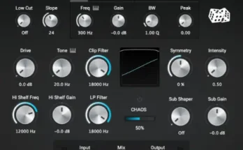 Each of the three equalizer bands has a harmonics function with two parameters: Drive and Out.