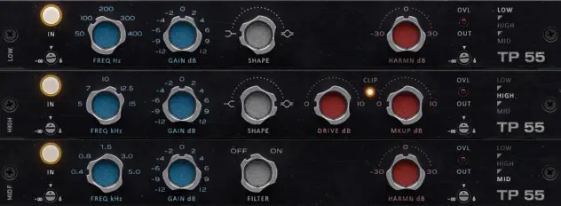 High band and dynamic stage. Features the same shelf to bell interpolation as the low band. This instance also contains a unique subtle low level harmonics which adds a little punch to the signal. The drive control will also clip material. If the low level harmonics feature isn’t desired there is a Instance called NFRD (stands for ‘No Full Range Distortion’) The clip is still featured on this version. Gain -12,-9,-6,-4,-2,0,2,4,6,9,12 Frequency 5,7,10,12.5,15kHz