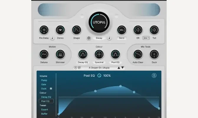 Utopia combines a new level of control with an intuitive interface and a whole host of presets for engaging experimentation. Use the color section to effortlessly transition from flat to colored reverb responses. This single, smooth control affects decay, spectral characteristics, and post EQ. Then mold the onset and initial decay of the reverb with the Shape section. Each shape preset offers a unique configuration for swells, fades, and sustain.